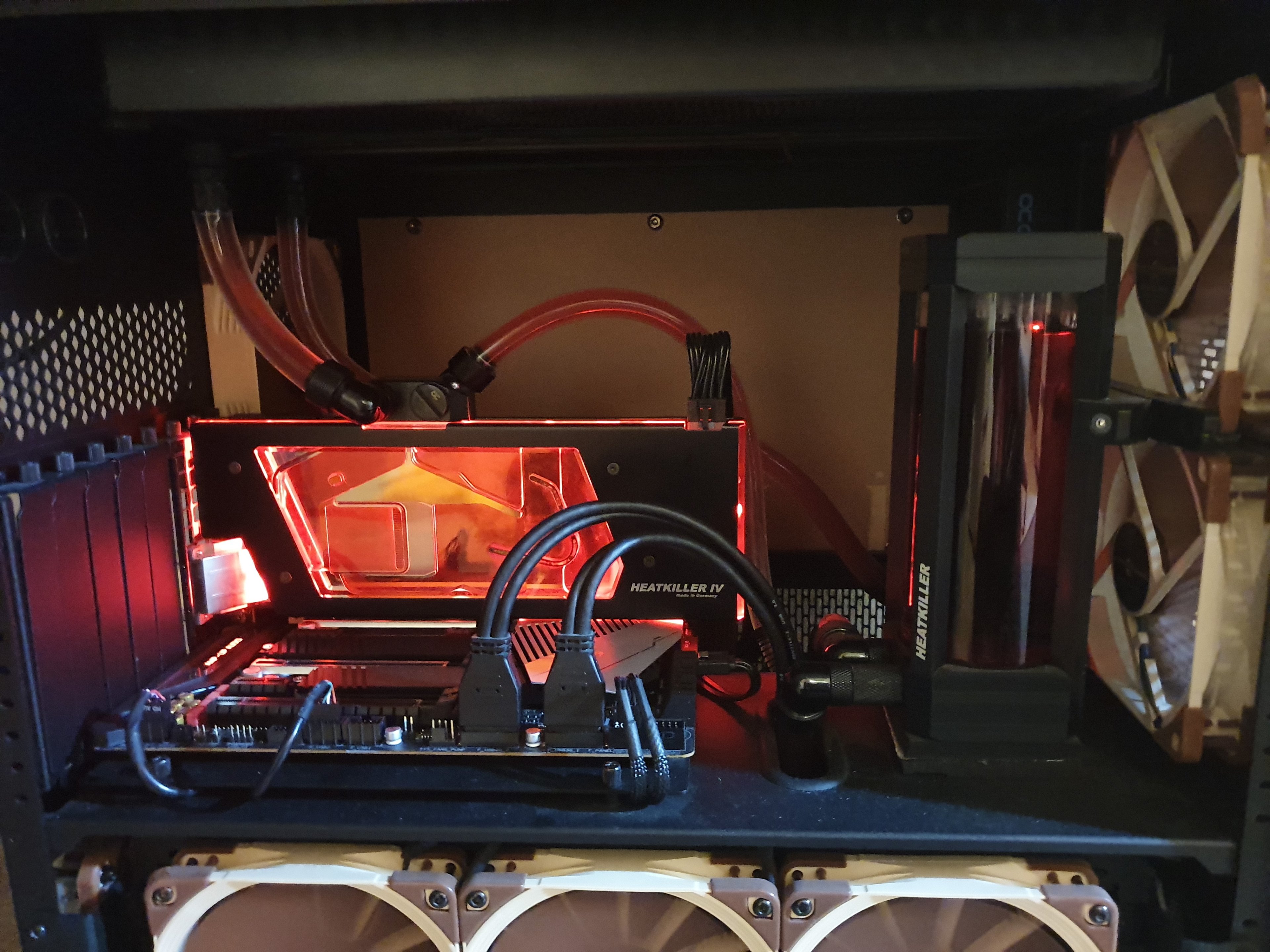Zum Gehäuse bzw. den Radiatoren: Ich würde die Radiatoren Seite (480) & unten (360) einbauen. Dann bleiben dir hinten/oben insg. 3x140er und vorne 3x140er. Richtung: Radiatoren rein, Gehäuselüfter raus. Das ist in dem Fall m.E. die optimale Lösung. Alternativ kann man das auch noch um einen 480er erweitern. Ins Gehäuse passen zwei 30mm 480er plus der 360er am Boden (hab das selber so montiert - ist aber ne enge Sache).