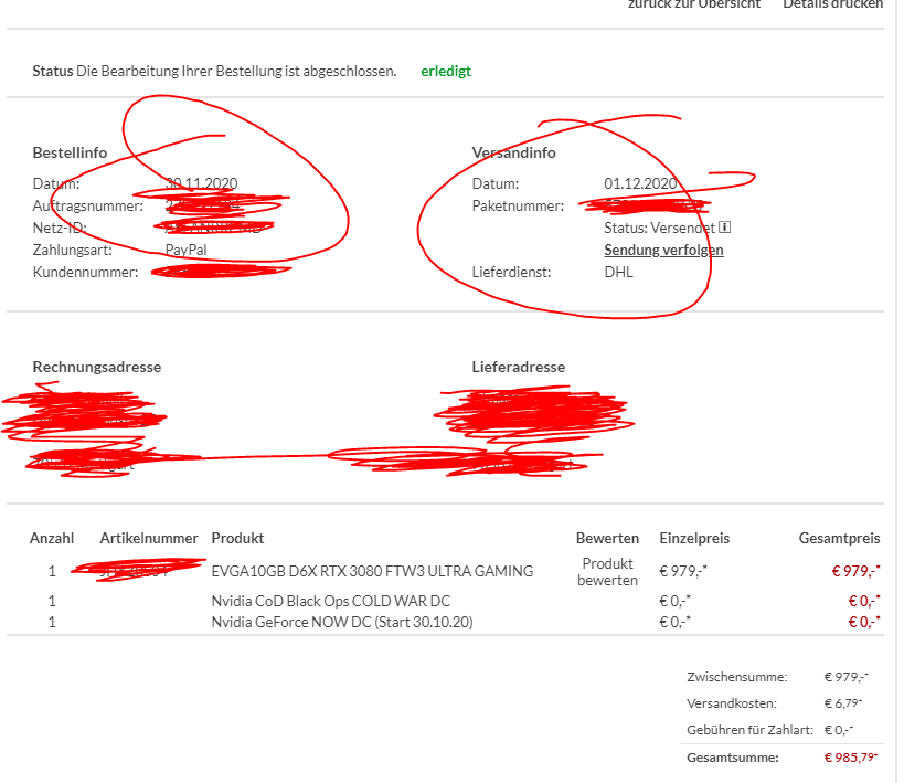 Ich hab z.b. Noch eine Vorbestellung einer msi 3080 ventus laufen. Seit Mitte/Ende September. Für 799 Euro vorab bezahlt...