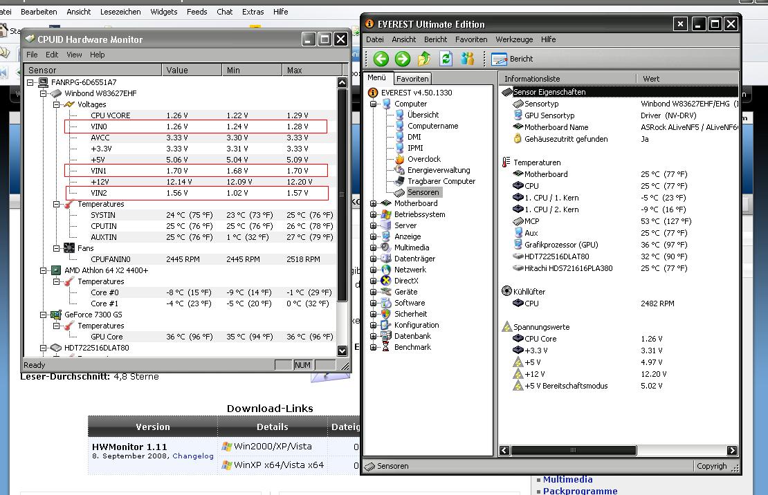 auf ein Tipp im Forum den ich gerade hier gelesen habe habe ich mir auch mal HWMonitor runtergeladen.. weil bei mir -° Werte angezeigt werden.. was defenetiv nicht sein kann.. na gut daran hat sich nichts geändert.. jedoch ist mir aufgefallen das dort mehr Spannungen angezeigt werden als in Everest..