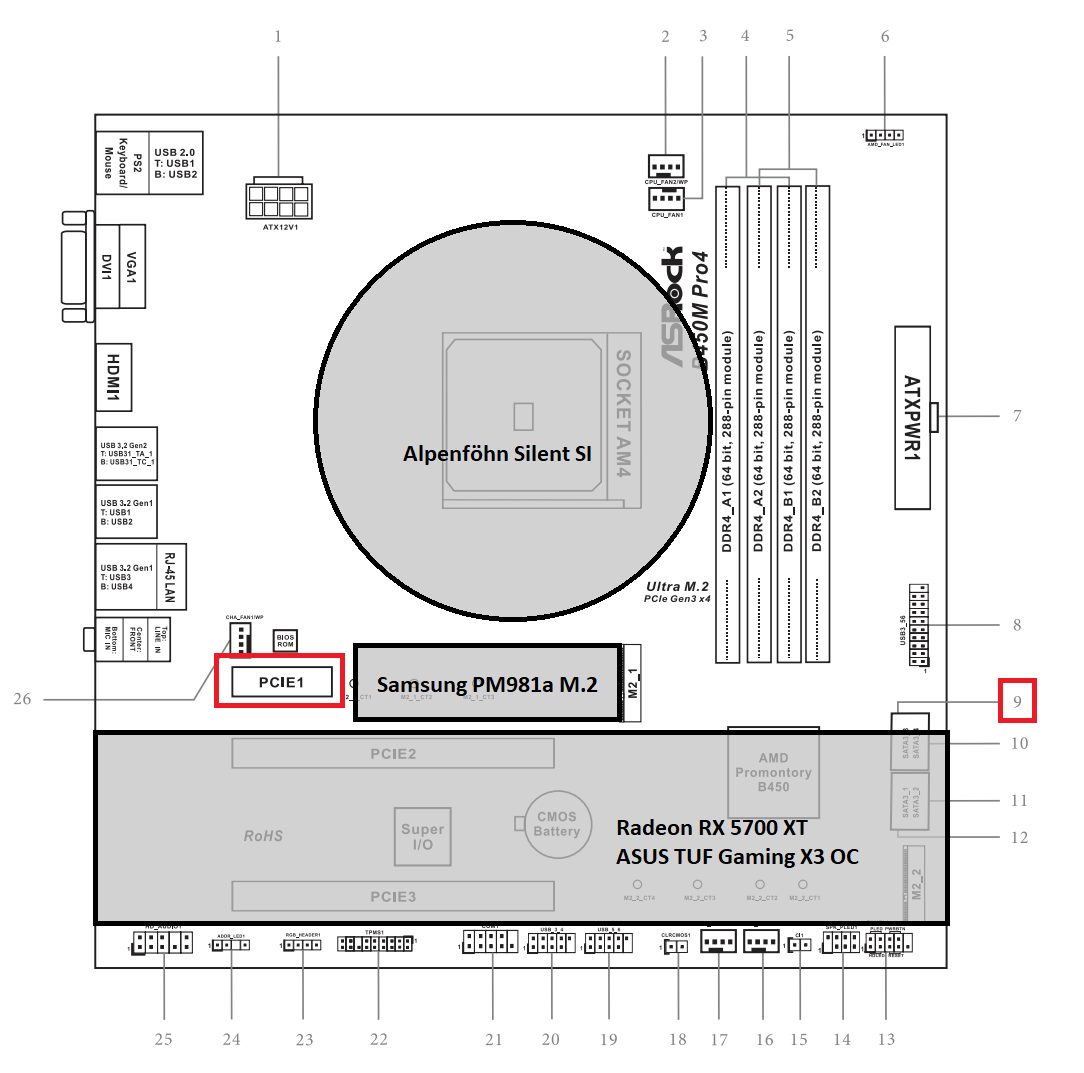 Die Bedienungsanleitung des Mainboards findet man hier, aber ich werde nicht so recht schlau daraus: https://download.asrock.com/Manual/B450M Pro4.pdf#page=13&zoom=100,0,0