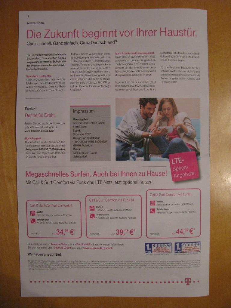 Apropos Marketing: In meiner Region hat ein regionaler Anbieter mit Finanzspritze aus öffentlichen Geldern von max. DSL 6.000 (von Telekom) auf VDSL 50.000 ausgebaut und bietet das nun zu fairen Preisen an. 2 Monate nach der Freischaltung flattern in alle betroffenen Haushalte magentafarbene Flyer die "superschnelles" Internet bewerben rein. T-Com LTE. Ich frage mich wie viele Leute wohl darauf hereinfallen werden.