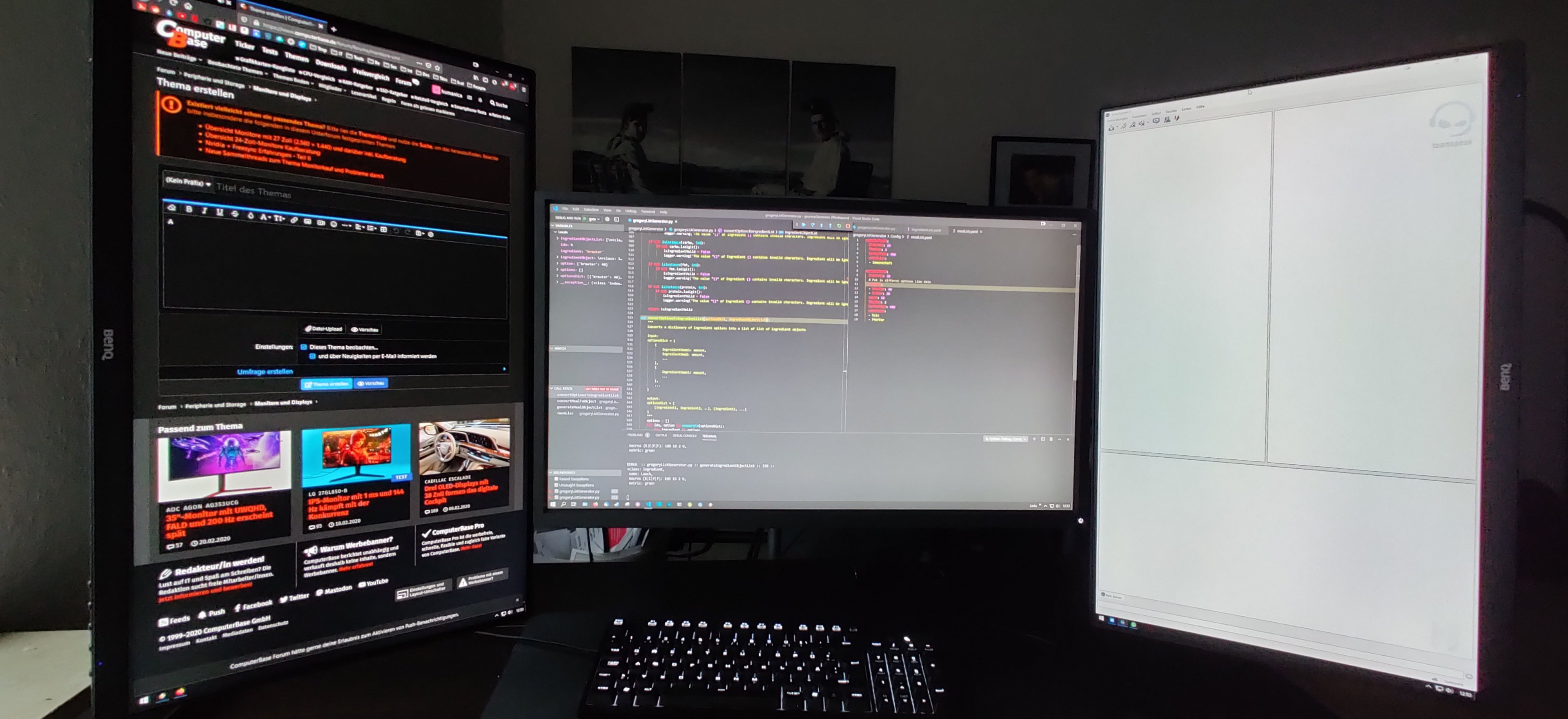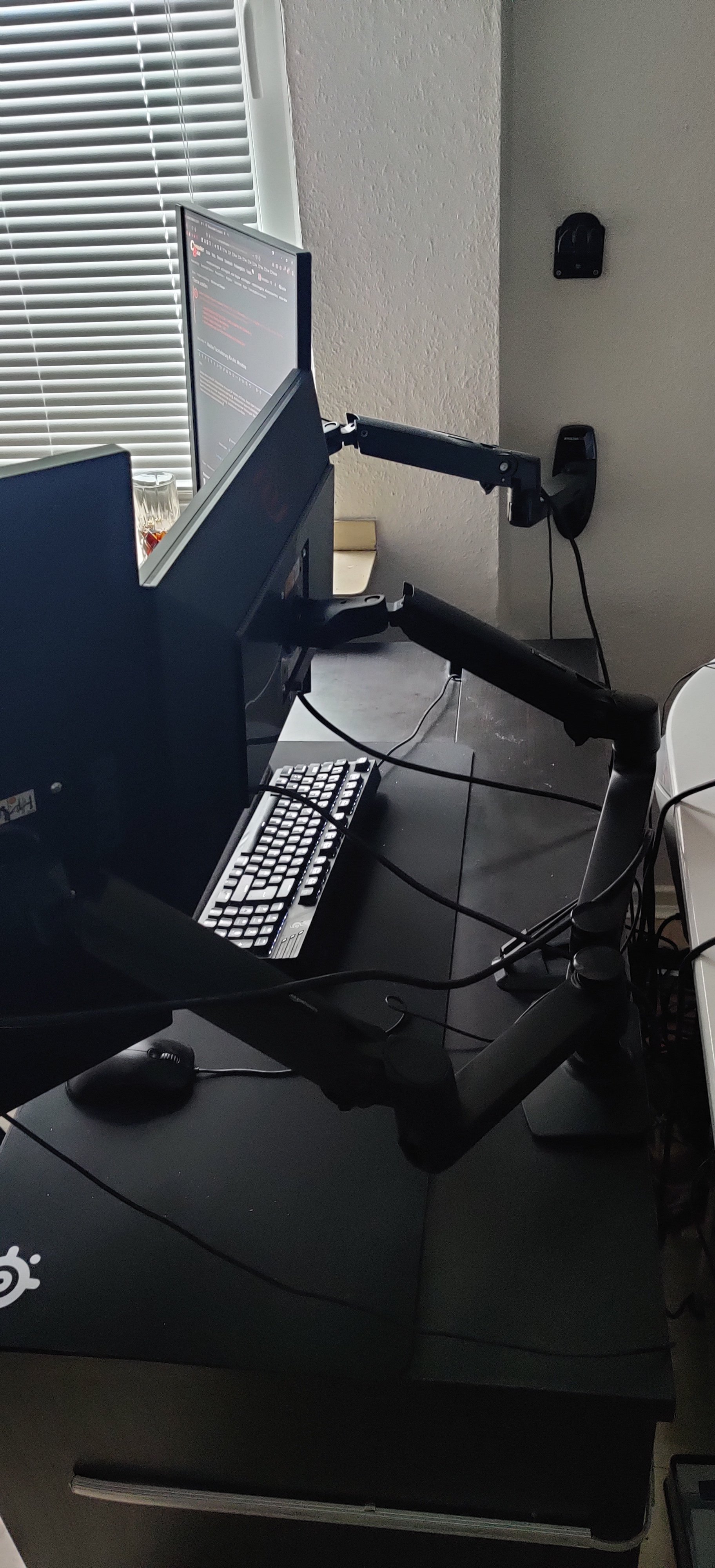 ich habe aktuell einen 25" im Querformat sowie zwei 24" hochkant im Einsatz. Aktuell habe ich eine single und eine Dual Amazon Tischhalterung. Die Halterungen haben eine gute Qualität, die Bildschirme lassen sich allerdings einzeln bewegen. Das führt leider dazu, dass sie nie perfekt zueinander ausgerichtet sind. Ich suche nun nach einer Halterung die alle drei Monitore aufnehmen kann und an einer fixen Position hält. Das ganze müsste allerdings ausziehbar sein, siehe Bilder.