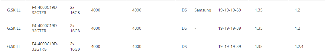 | G.SKILL | F4-4000C15Q-32GTZR | 4x 8GB | 4000 |