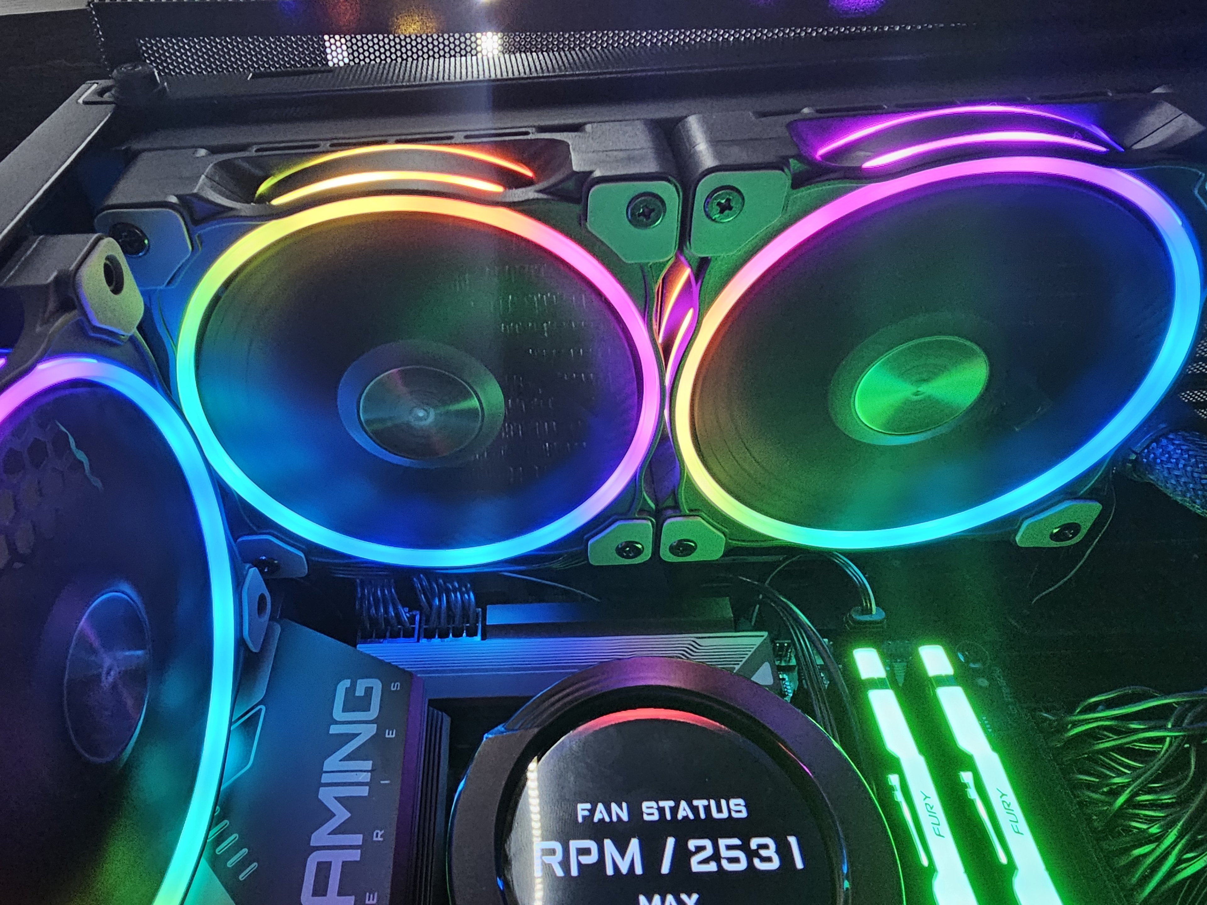 als Lüfter sind die Alpenföhn 120mm Wing Boost 3 ARGB PWM-Lüfter verbaut ( 3x vorne 1x hinten 2x auf dem Radiator noch oben pusten )