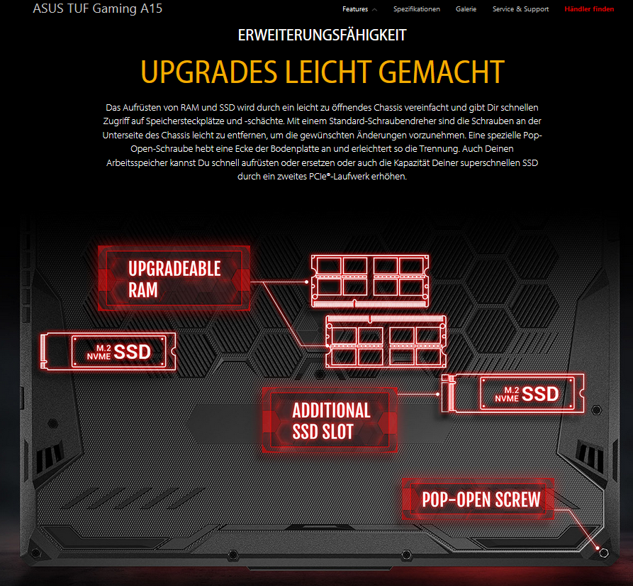 ASUS TUF Gaming A15 FA506IV-HN291 Bonfire Black ein wirklich leistungsstarkes und für den Preispunkt sehr ausgewogenes Gesamtpaket. Zudem wurde bei dem Gerät auf eine leichte Wartbarkeit durch den Endkunden wert gelegt, was nachträgliche Aufrüstvorhaben als sehr einfach gestaltet: