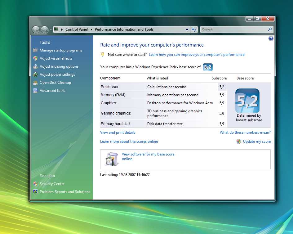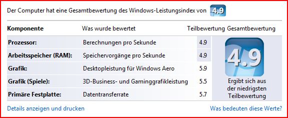 Jede Hardwarekomponente erhält eine eigene Teilbewertung. Die Indexbewertung des Computers wird durch die niedrigste Bewertung bestimmt. Wenn beispielsweise die niedrigste Bewertung einer einzelnen Hardwarekomponente bei 2,6 liegt, beträgt die Indexbewertung ebenfalls 2,6. Die Basisbewertung entspricht nicht dem Durchschnitt der verschiedenen Teilbewertungen.