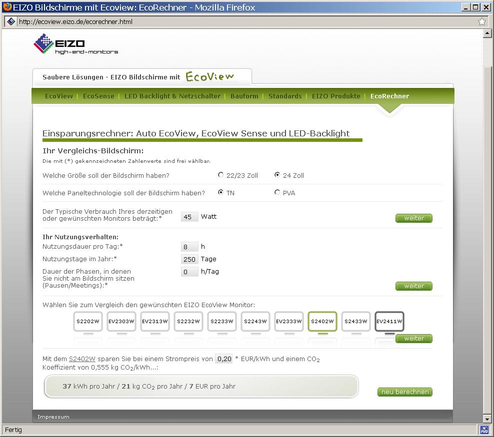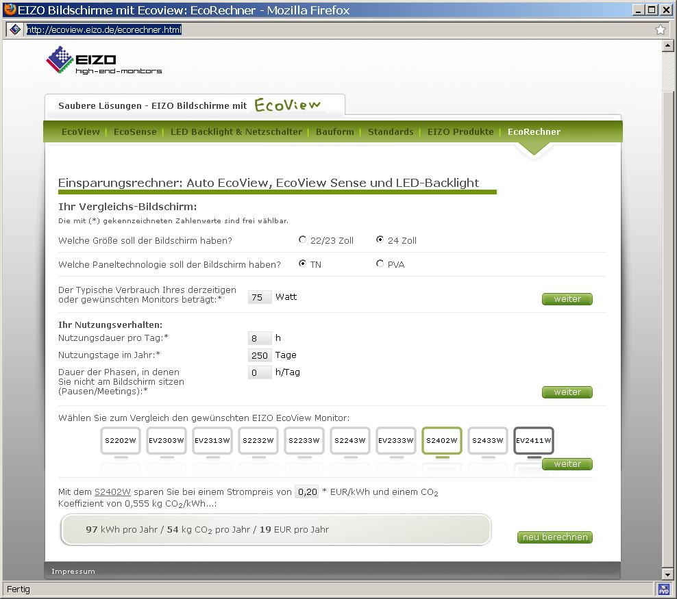 Im Anhang die Eco-Rechnung von Eizo, mit 45, 60 und 75 Watt Vergleichsgröße zum genannten S2402WE. Es lohnt nicht wegen der (heutigen) Strompreise, ökologisch scheint der Eizo jedoch auf der Höhe der Zeit.