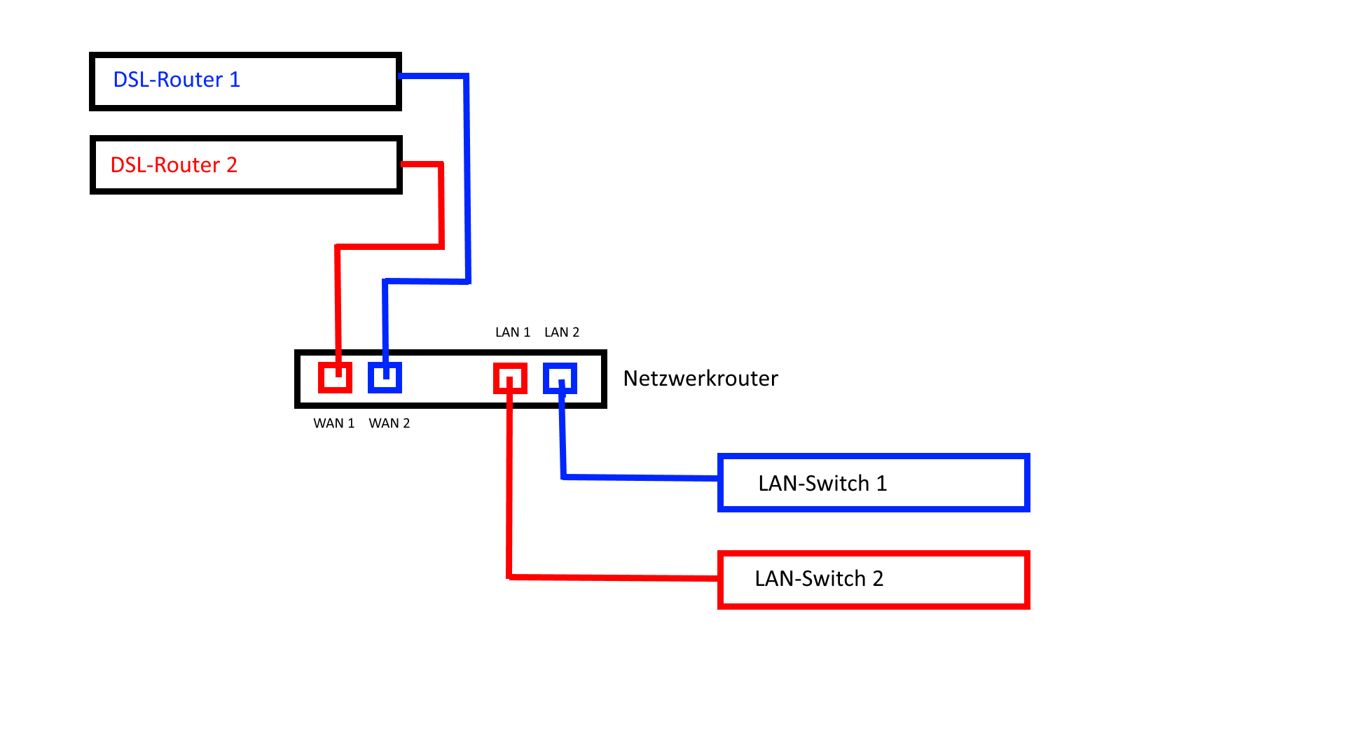 Netzwerk A kann Bandbreite beider Anschlüsse addieren und nutzen (5Mbit + 5Mbit ~ 10Mbit).