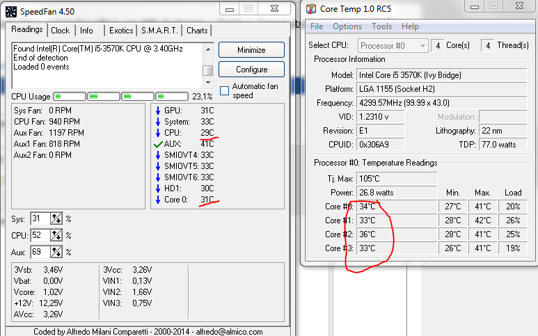Nur zum Vergleich wollte habe ich mir Coretemp runtergeladen und auch während des Stresstest geöfftet. Coretemp zeigt mir allerdings Traumtemperaturen von 29 Grad (!) an.