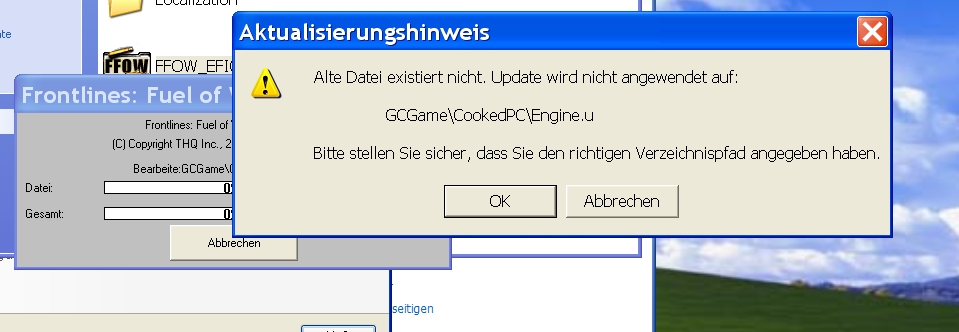 zum Frontlines Fuel of War habe ich mir den Patch_ALL_To_1.1.0 exe und den Patch_All_To_1.1.1.exe runtergeladen. Beim Versuch den 1.1.0exe zu installieren, erhielt ich die Nachricht: "Alte Datei existiert nicht..." s. Screenshot unten.