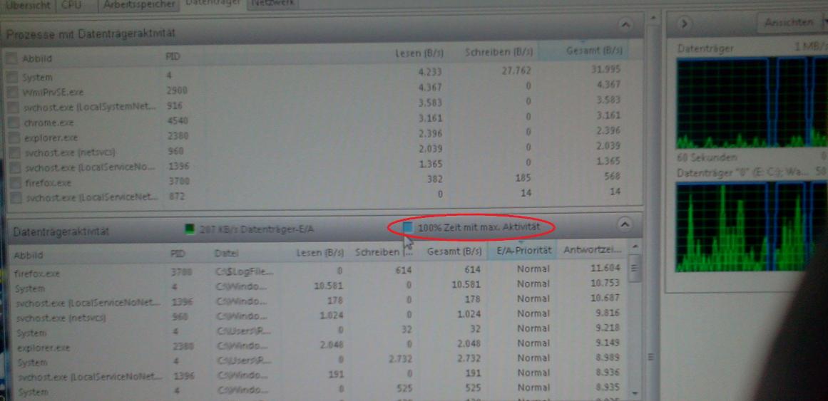 ich hab leider ein Problem, dass ich schon etwas länger habe. Nach einiger Zeit reagiert mein Pc nicht mehr, nach ca paar Sekunden so 10-15 Sek oder sogar mal 45 Sekunden geht's wieder. Der Fehler trettet fast immer wieder auf, plötzlich 100% Festplattenaktiviät (Siehe Screen) ich versuche schon so lange den Prozess zu finden der meine Festplatte komplett auslastet. Doch ohne Erfolg, könnt ihr irgendwas ungewöhnliches auf dem Bild erkennen?