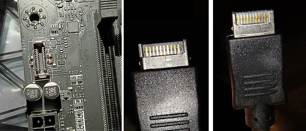 Auf dem MSI B650 Gaming Plus habe ich nur eine Anschlussmöglichkeit mit der Bezeichnung JUSB1 gefunden, die passend aussieht und die Bezeichnung »JUSB1: USB 3.2 Gen 2 10Gbit/s Typ-C Frontplattenanschluss« trägt. (Siehe Foto und Zeichnung.)