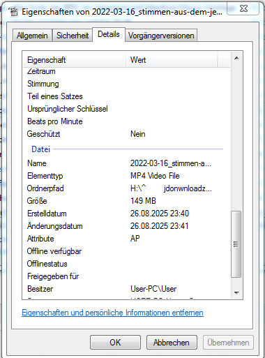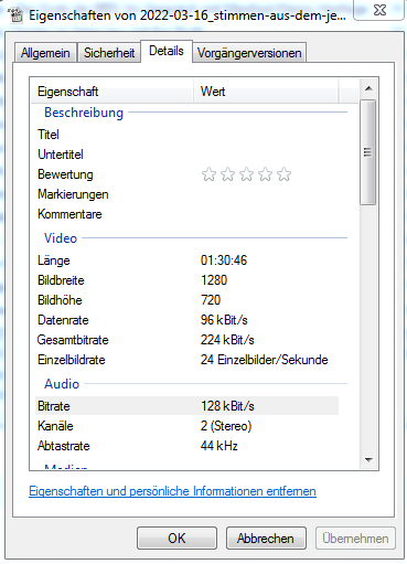 ich habe da mehrere Videos heruntergeladen Auflösung: 1280-720 Länge: 1:40:00 Datenrate 96 kbps Grösse: nur 153 MB Gesamtbildrate: ca 230 kbps
