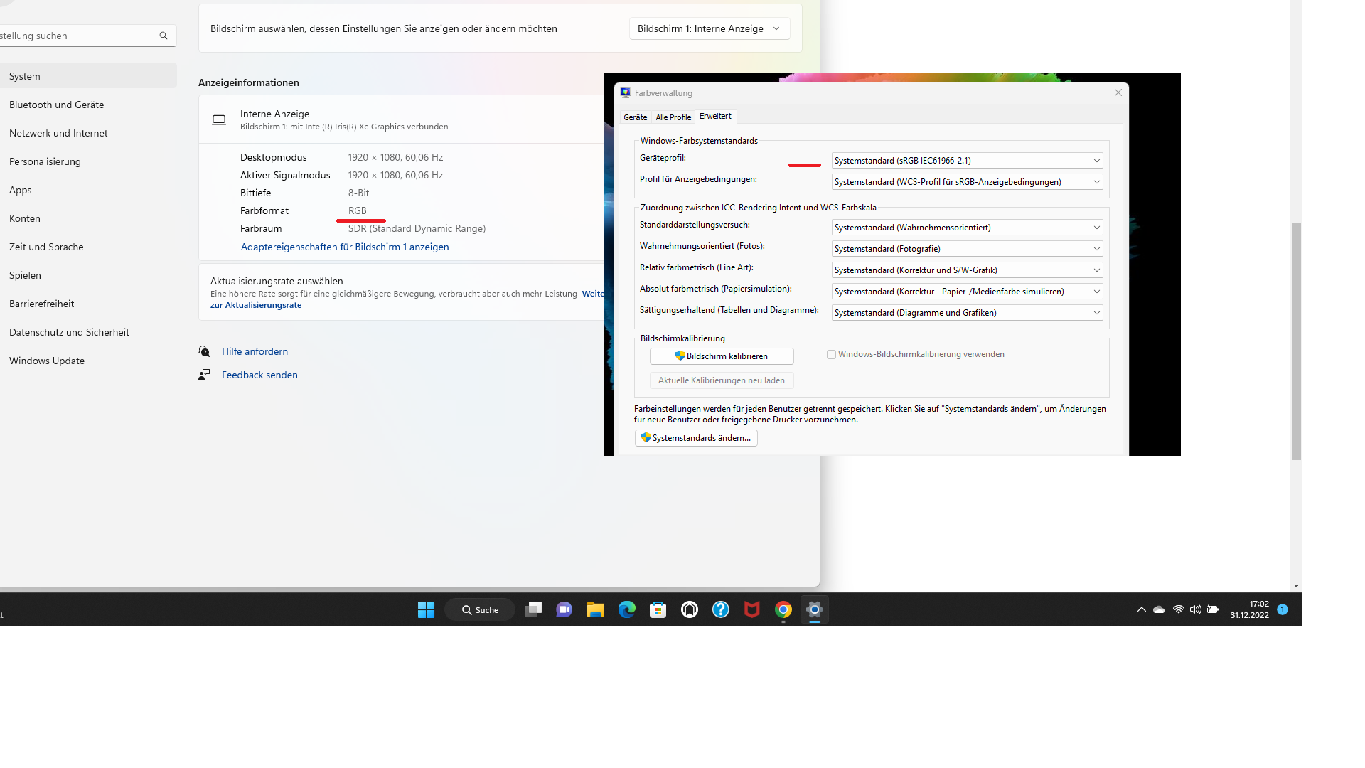 Und was passiert wenn ich einen externen Monitor hole mit 99% SRGB und den kalibrieren will mit einem Kalibriergerät. Weil wenn Windoof RGB anzeigen will macht das natürlich keinen Sinn, weil der Monitor eben nur SRGB umfänglich anzeigen würde und das Kalibriergerät vielleicht nicht genau arbeiten kann, wenn auf einem SRGB Monitor RGB schlecht dargestellt wird durch Windoof 11? Es muss ja auf SRGB einstellen.
