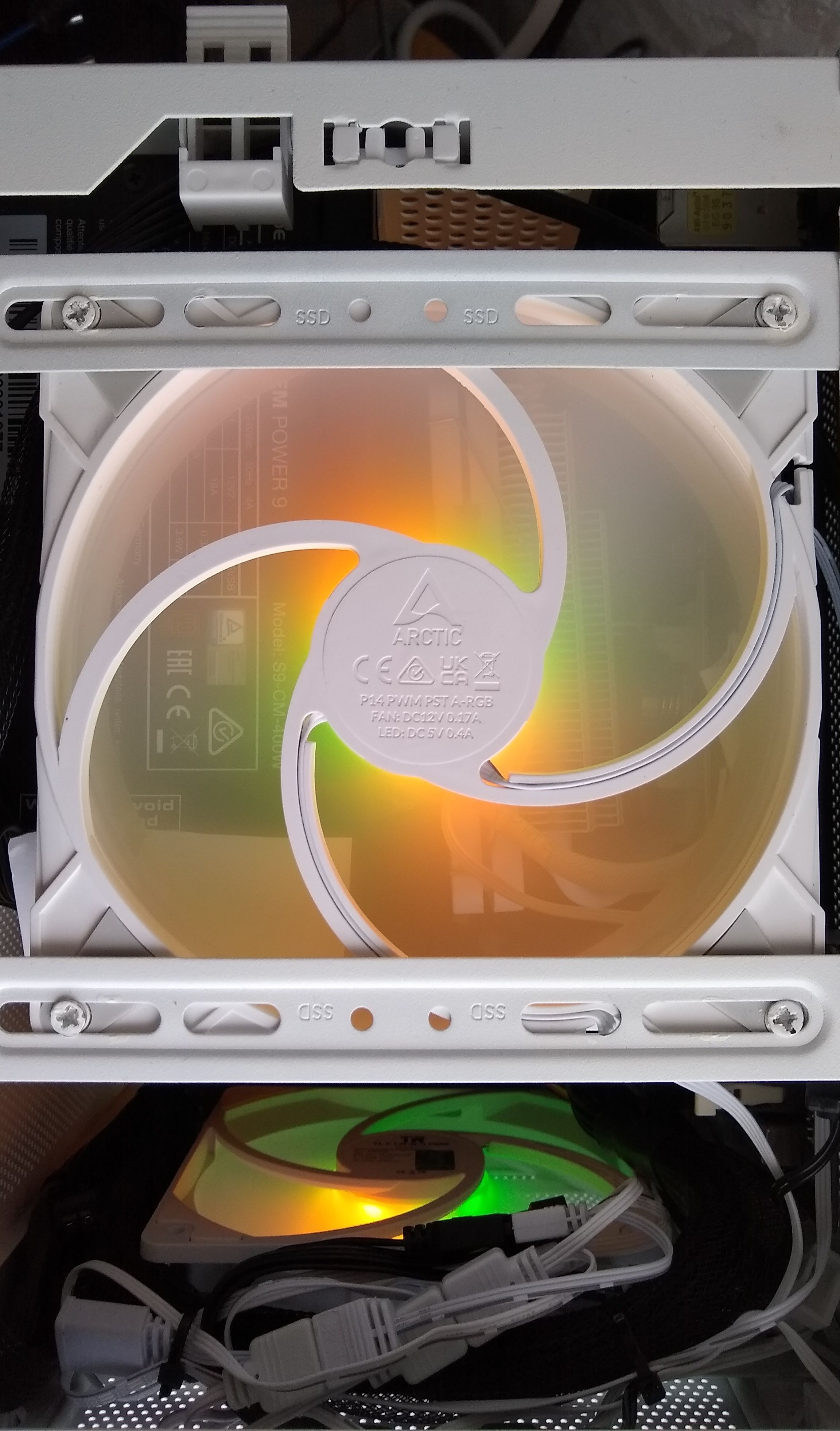 https://www.amazon.de/dp/B0C4D3TF5T) verbaut, der eine Höhe von 67 mm haben soll. Mit 6 Heatpipes und 120 mm Lüfter schien mir das schon einer der stärkeren Topblower zu sein. Das RGB hätte es an der Stelle nicht gebraucht, weil der Lüfter zum großen Teil vom Netzteil verdeckt wird, aber es ist nun mal da und komplett in weiß passt er halt zum Rest. Zwischen Netzteil und Topblower ist nun noch ein Zeigefinger breit Luft.