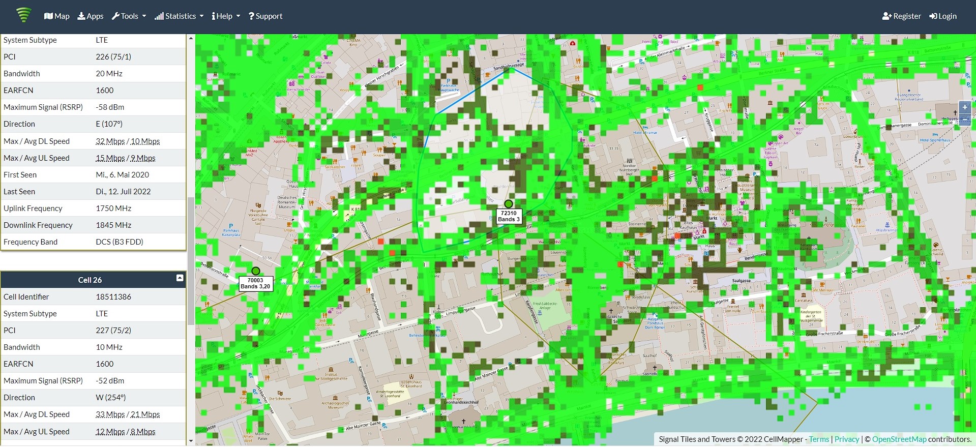 Beim Sendemast der im Osten steht, gibt es kein Max / Avg UL Speed. Aber wenn ich richtig verstanden habe, wäre es besser wenn ich mein LTE Router so ausrichte, das er eher in die Richtung von dem Sendemast schaut, der im Osten ist weil er näher ist. Das probiere ich heute Abend gleich aus, bin mal sehr gespannt