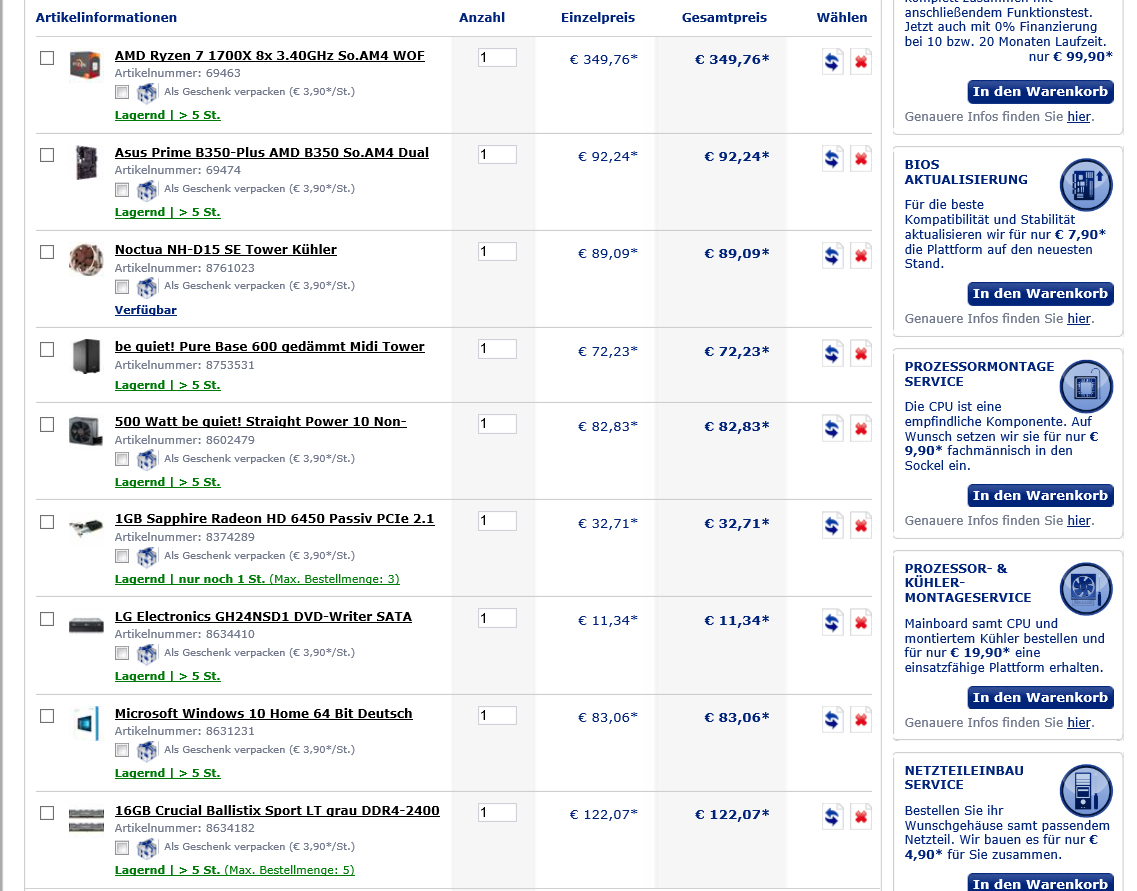 Die Ryzen CPU hat ja keinen internen Grafikchip oder so, deswegen mus noch eie passive GraKa rein, ist ja auch nicht schlimm. Mit DVD Player und Windows 10 64 Bit ist das alles nicht mal 1000 Euro. Also schon ein lohnenswerter PC.