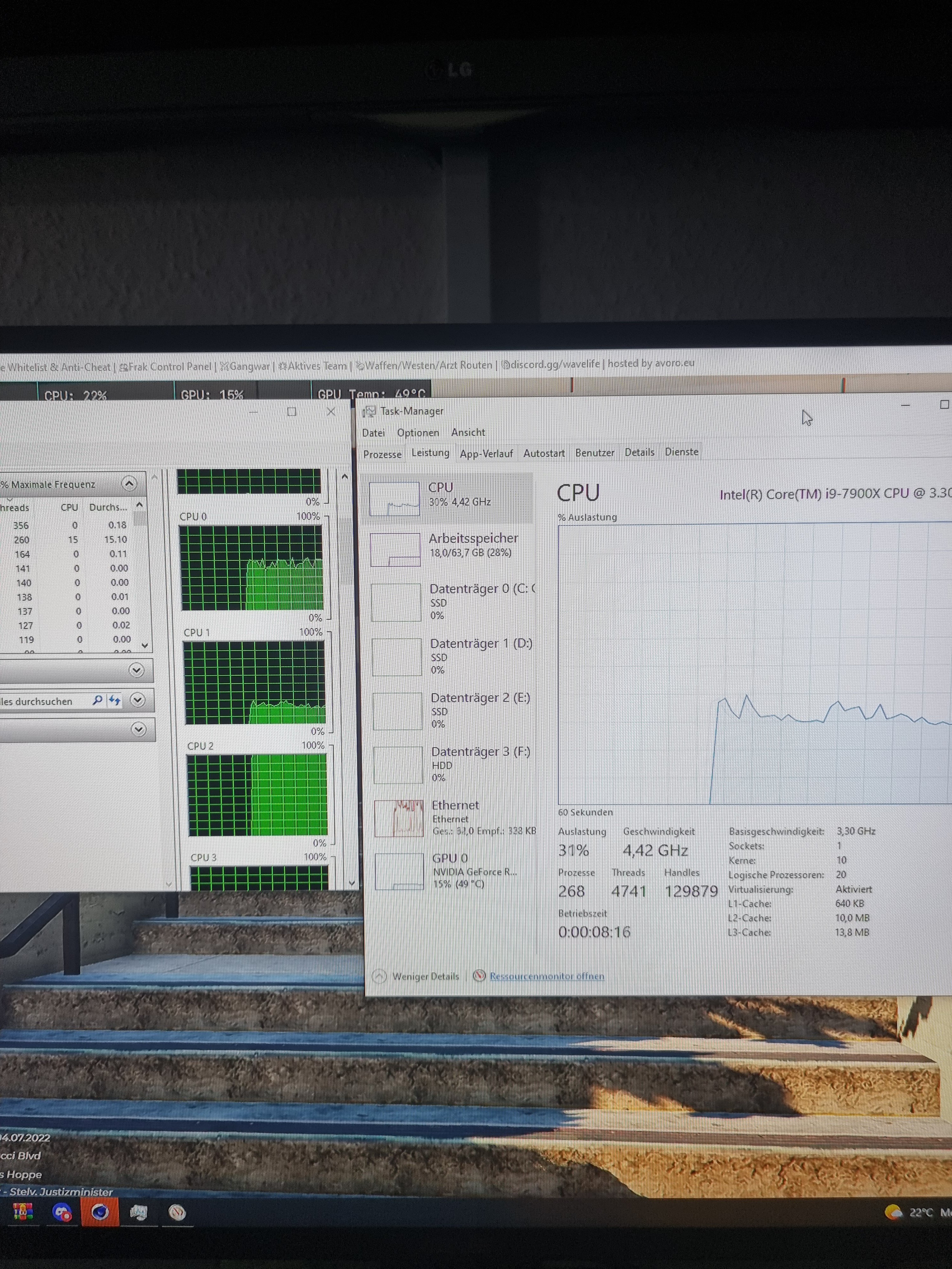 wenn du im taskman auf den cpu-graph rechtsklickst und "graph ändern in... logische prozessoren" anwählst, hast du auch dort alle kerne in der übersicht und brauchst nicht den ressourcen monitor extra zu starten.