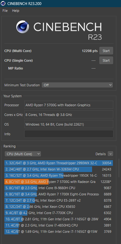 Baal Netbeck schrieb:Du lädst dir Cinebench R23 runter....entpackst es...startest die Cinebench.exe....akzeptierst die Nutzungsbedingungen...klickst auf File->advancedBenchmark", stellst die minimum Test duration auf off(sonst macht der ne Endlosschleife)....dann klickst du auf Start bei CPU(Multicore) und wartest bis er fertig ist.....dann kannst du das Ergebnis mit gleichen CPUs in dieser Liste Vergleichen.