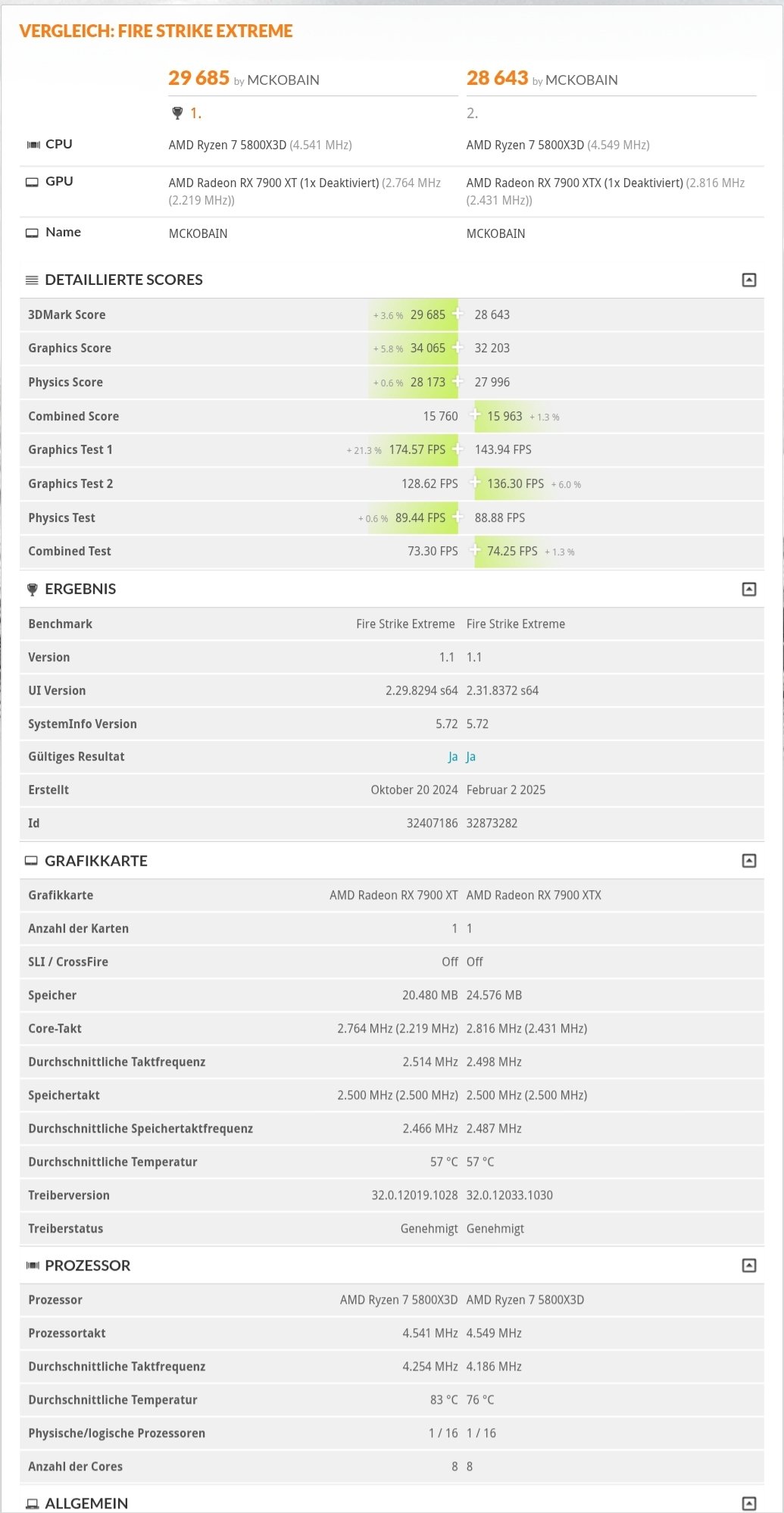 Die CPU scheint "kühler" zu laufen aber auch mit weniger Takt bei der 7900 XTX. Ist nicht "viel". Aber vielleicht lief gerade während des ersten Graphics Test irgendwas noch im Hintergrund.