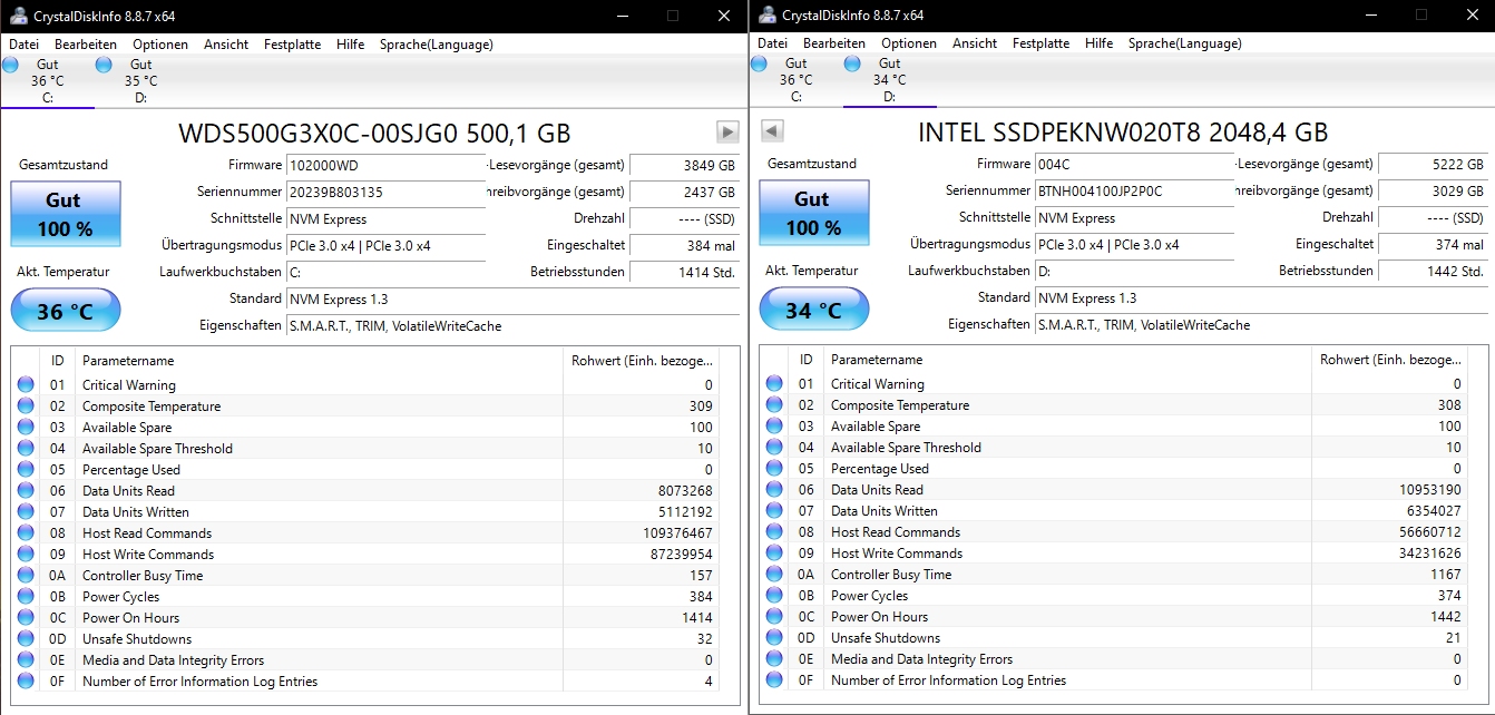 • Für beide m.2-Platten sind die zugehörigen Dashboards der Hersteller installiert. Firmware ist in beiden Fällen aktuell und auch der allgemeine Zustand wird als sehr gut ausgegeben, was ebenfalls durch CrystalDisk bestätigt wird
