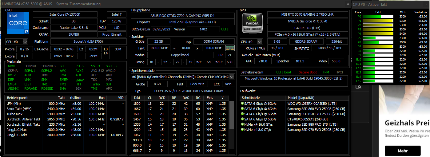 - HDD / SSD:SAMSUNG 980 Pro 1 TB m2 ssd, SAMSUNG 850 250 GB, SAMSUNG 860 250 GB, Crucial BX500 240 GB, SAMSUNG SSD 970 250 GB m2 ssd, Western Digital 1 TB Festplatte