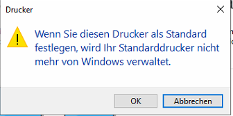 habe auf einem im Netzwerk (Domäne) laufenden Win 10 PC einen lokalen Drucker (USB) installiert. Setze ich den jetzt zum Standard, meint Windows "Wenn sie diesen Drucker als Standard festlegen, wird er nicht mehr von Windows verwaltet."