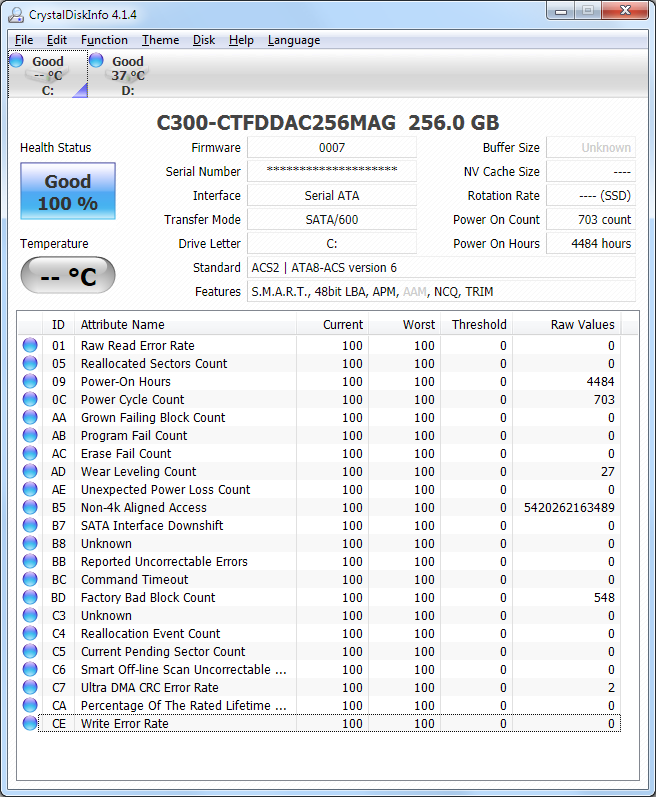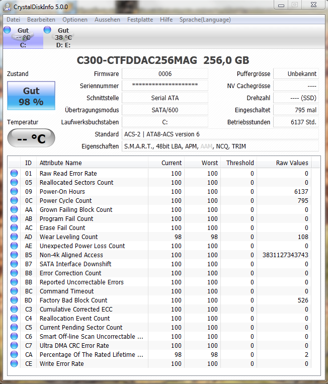 Weil der Zähler der Crucial linear läuft und wirklich realistisch bis 0 runterzählt (der aktuelle wert, der fängt dann wieder bei 100 an während der Row-Value von 0 aus hockzählt), wenn der Row-Value des Attributes 0xAD den Wert von 3000 erreicht hat. So alle 30 Werte von AD geht die Restlebensdauer eines runter. Bei 3000 ist aber lange nicht Schluss, im Dauerschreibtest ist die m4 64GB schon bei fast 18000 Zyklen und hat noch keine Reallocated Sektors:Satsujin schrieb:Wieso ist deine M4 jetzt schon bei 98%?