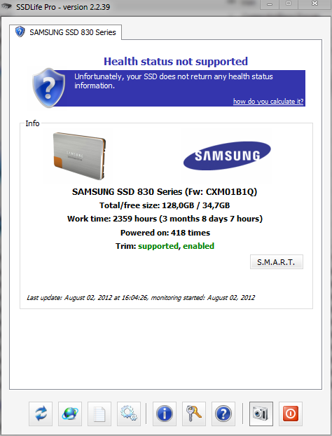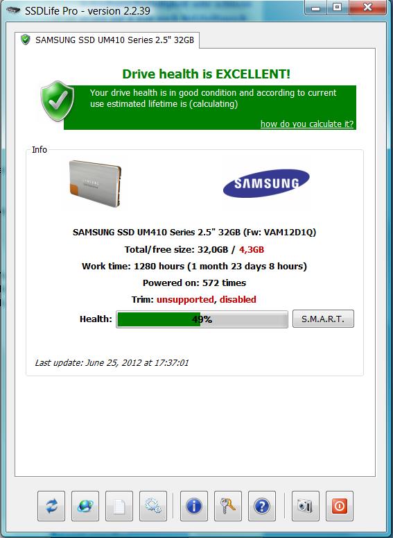 Das ist eine uralte Samsung die man mit aktuellen Modellen nicht vergleichen kann. Obendrein ist sie mit nur 32GB Kapaztität, von der im Moment gerade mal 4.3GB frei sind und ohne TRIM Unterstützung sowieso im Nachteil. Andererseits sagt ja niemand, dass sie beim Erreichen von 0 wirklich defekt sein wird, die kann dann noch ein vielfaches der Zeit/Datenmenge überleben.