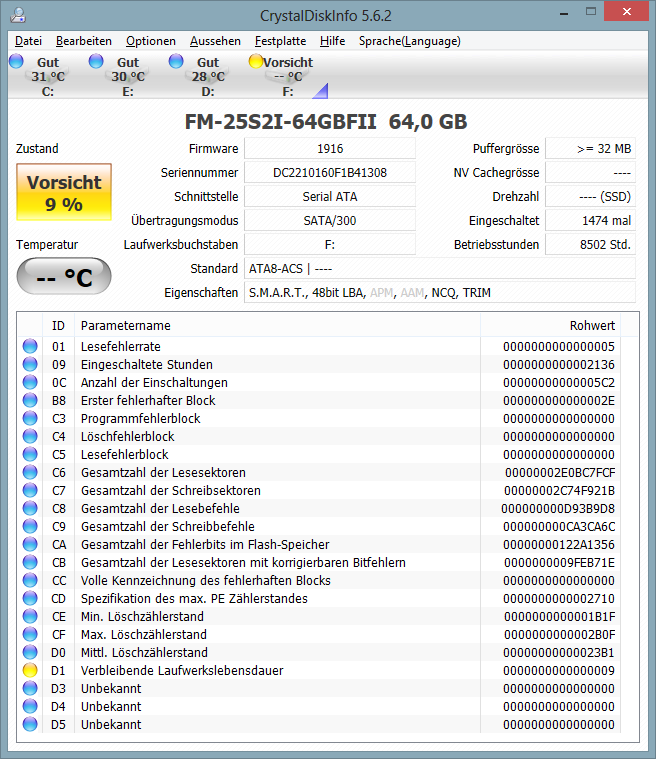 Das ist ja das traurigste an der Sache, das Wear Leveling funktioniert bei dem Barefoot auch noch ganz mies. Ok, andere Controller zeigen die Werte nicht an, aber der Barefoot zeigt sie deutlich und da siehst Du ja selbst, wie groß der Unterschied zwischen den minimalen Zyklen (CE), den Maximalen (CF) und eben der Durchscnittlichen (D0) ist. Bei Deiner ist der sogar noch gering, da habe ich schon viel krassere Beispiele gesehen. Ich glaube davon finden sich auch wenige am Anfang dieses Treads.