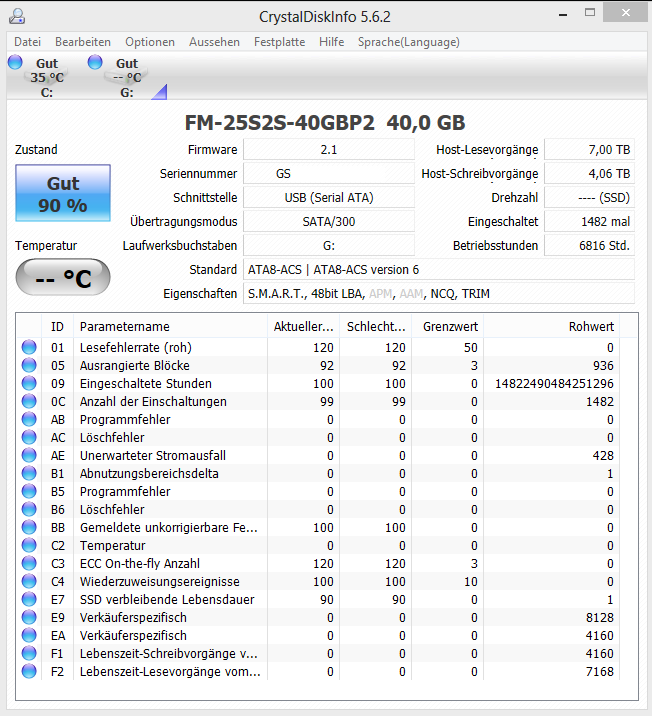 Bei der mit 90% in der Anzeige war die Write Amplification mit fast 1,94 übrigens deutlich höher als bei der anderen, die nur 0,95 hat.
