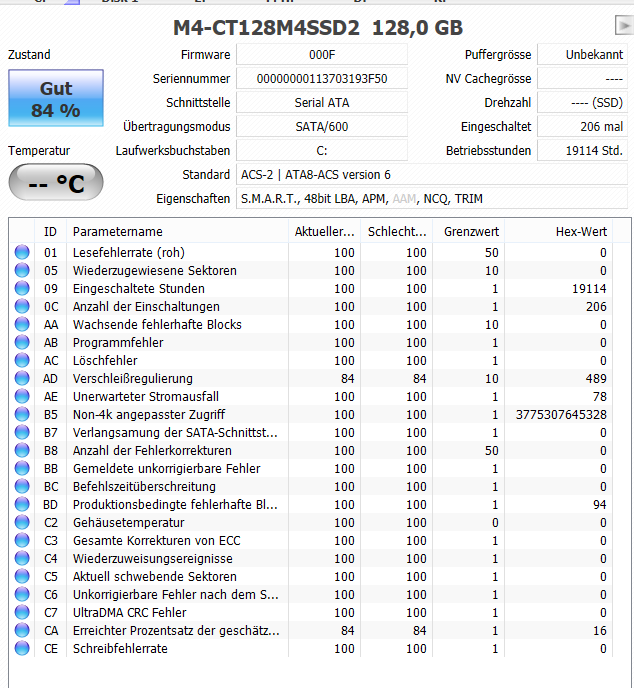 Die anderen HHDs in dem System liegen teils drüber mit 23903h und teils drunter mit 12664h, 15189h, 14337h und 3725h. Zwei der HDDs haben auch schon schwebende bzw. unkorrigierbare Sektoren. Da gibt die M4 wohl keinen Anlass zur Sorge.