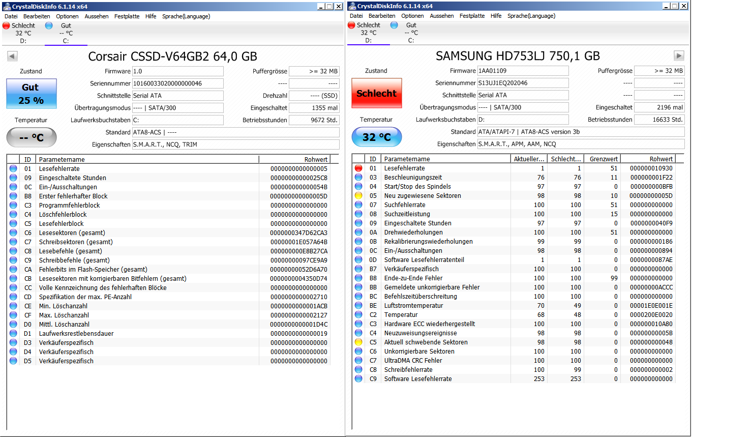 Das war mir klar, aber ich wollte trotzdem darauf hinweisen, dass es der einen Platte nicht gut geht. Solche Probleme können manchmal auch die Performance der anderen Laufwerke beeinträchtigen, weshalb man immer auch einen Blick auf die Werte aller Laufwerke werfen sollte, vor allem sollte sich bei denen der Rohwert von C7 nicht ändern und möglichst 0 sein.Darkone schrieb:@Holt