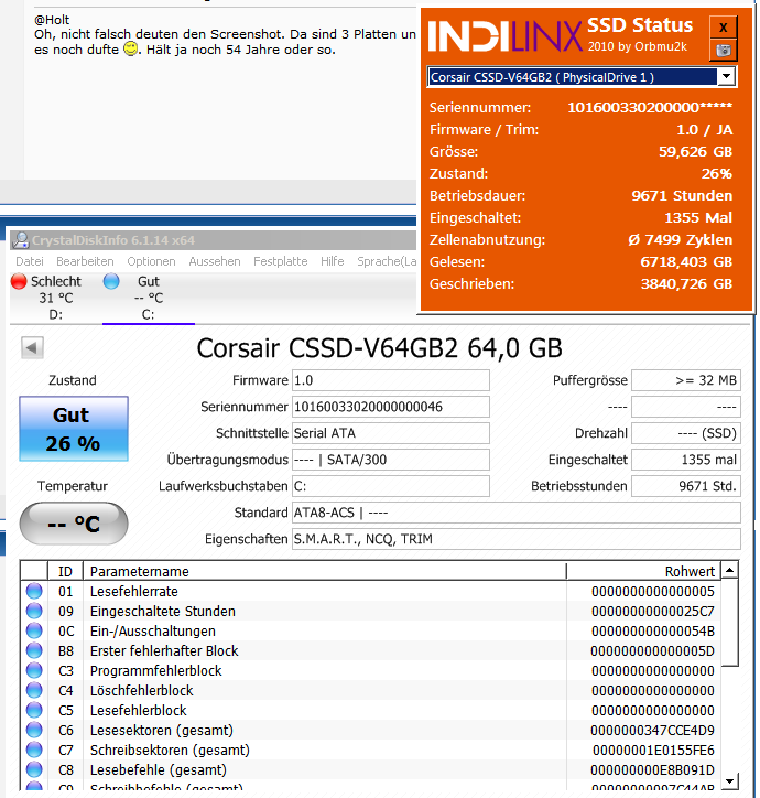 Teropet, es wäre schön gewesen, wenn Du das Fenster von CDI so weit aufgezogen hättest, dass man auch alle Attribute hätte sehen können. Das Indilinx Tool zeigt nur die Durchschnittlichen P/E Zyklen an, die mit 7499 schon sehr hoch sind, aber in den S.M.A.R.T. Werten sollte man außerdem die minimale und noch wichtiger, die maximale Zyklenanzahl ablesen können.