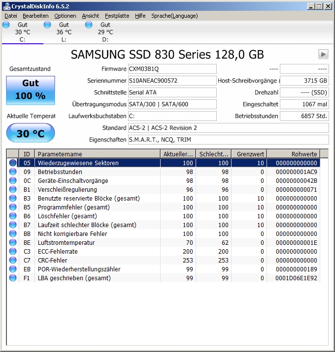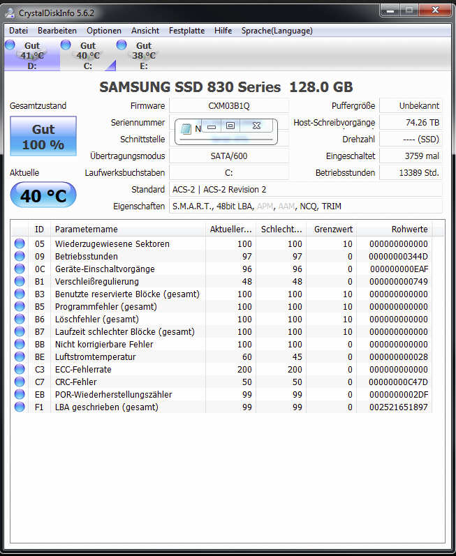 Danach habe ich als Gegenprobe nochmal CrystalDiskInfo gestartet. Ich war neugierig, wievele MB gleich beim ersten Test beschrieben worden sind.