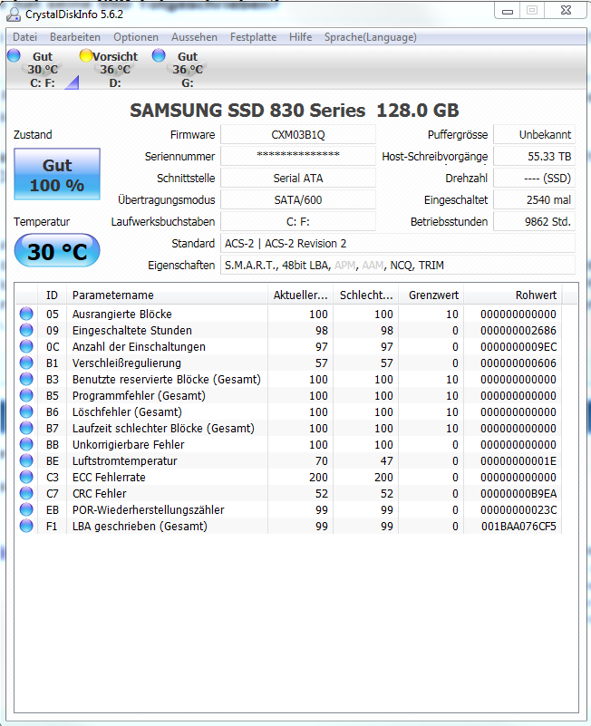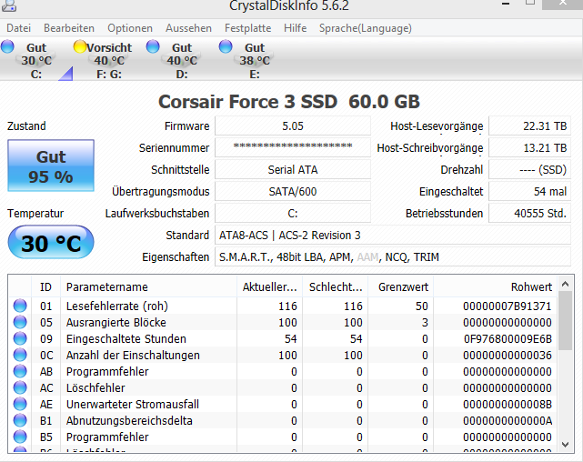 Nun bemerke ich, daß bei einigen der auf diesem Rechner ausgeführten Grid-Computing-Aufgaben derart viel auf diese SSD geschrieben wird, daß rein rechnerisch die 150TB nach ca. 2 Jahren erreicht sein werden :-(