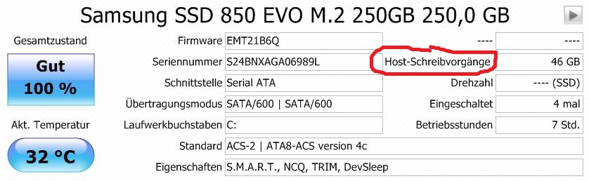 Nach dem Start habe ich direkt mit CrystalDiskInfo nach dem "Write"-Zähler geschaut und der stand wirklich bei 0.