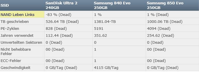 Samsung 850evo 250GB nach 1000TB und die Sandisk Ultra II 240GB nach 526TB totgeschrieben,