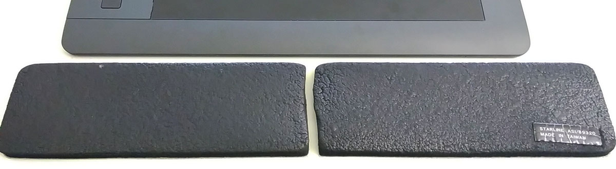 ... vor Jahren zweigeteilt, um es jeweils seitlich neben mein Grafiktablett – direkt dahinter befindet sich die Tastatur – zu legen als Unterarmauflage, sozusagen als Verbreiterung des Tabletts, damit sich meine Unterarme beim Tippen nicht ständig mit dem ca. 1 cm hohen Tablett "beißen".