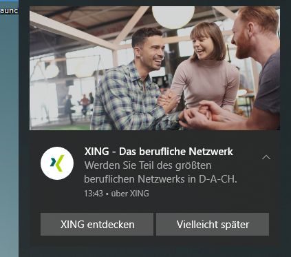 da starte ich eben mein PC und unten rechts über der Taskleiste bekomme ich ein Werbe-Pop-Up eingeblendet von XING.
