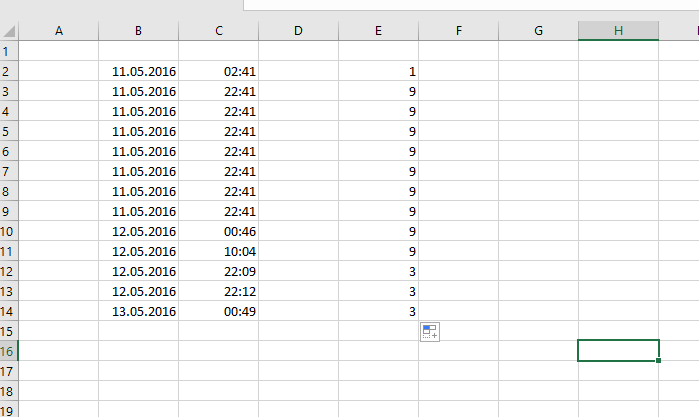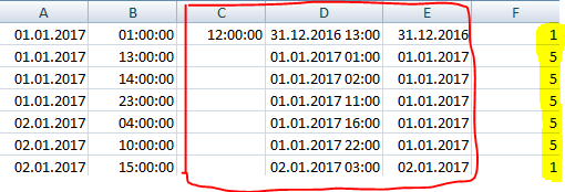 Ich möchte nun, dass ich eine Anzahl der Werte mit dem Datum bekomme, aber nicht nur in Abhängigkeit von dem Tag sondern sozusagen die Anzahl über die Nächte erfasse wenn Tage aufeinander folgen. Die Anzahl der hier eingefärbten Tage soll zusammenaddiert werden. Der Schnittpunkt bei den Uhrzeiten liegt bei 12:00 Uhr mittags.