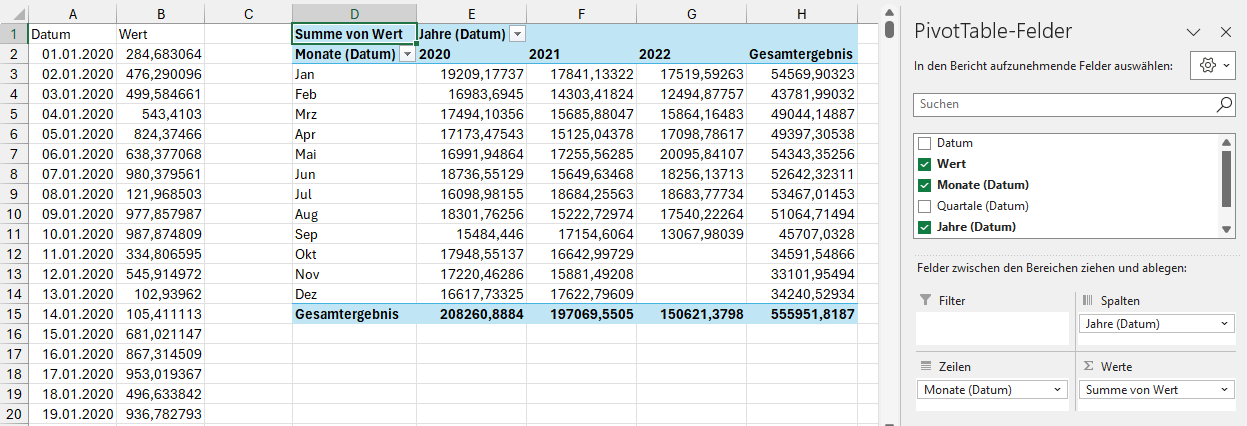 Ich habe eine Liste mit Werten, die taggenau untereinander aufgelistet sind also z.B 01.01.2002 x, 03.01. x (zwei Zellen) nun möchte ich die Summe aller x jeweils für den Monat z.B im Jahr 2001 dargestellt bekommen. Klar jetzt kann ich den immer den jeweiligen Bereich markieren und unten rechts schauen aber bei da es sich um mehrere Jahre handelt,bin ich da Stunden dran.