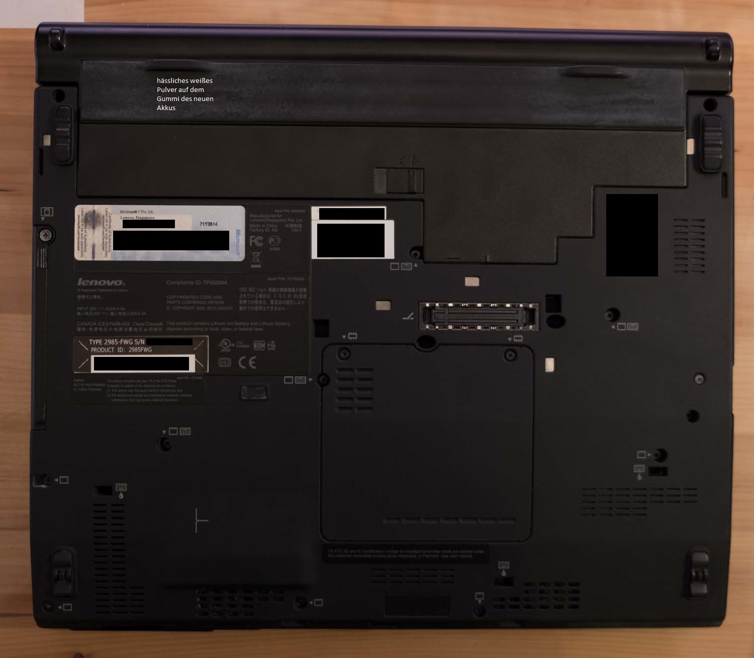 - Die Handballenauflage hat auch zwei kleineSchleifstellen vom Druck des Displayrahmens im geschlossenen Zustand. (Glatt polierte Stellen durch fettige Finger auf dem Touchpad/Handballenauflage hat es aber nicht.)