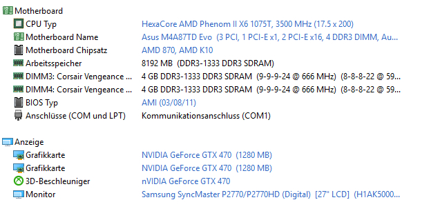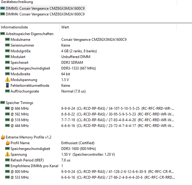 2x Arbeitspeicher: Corsair Vengeance CMZ8GX3M2A1600C9 jeweils 4 GB (insgesamt 8GB RAM)