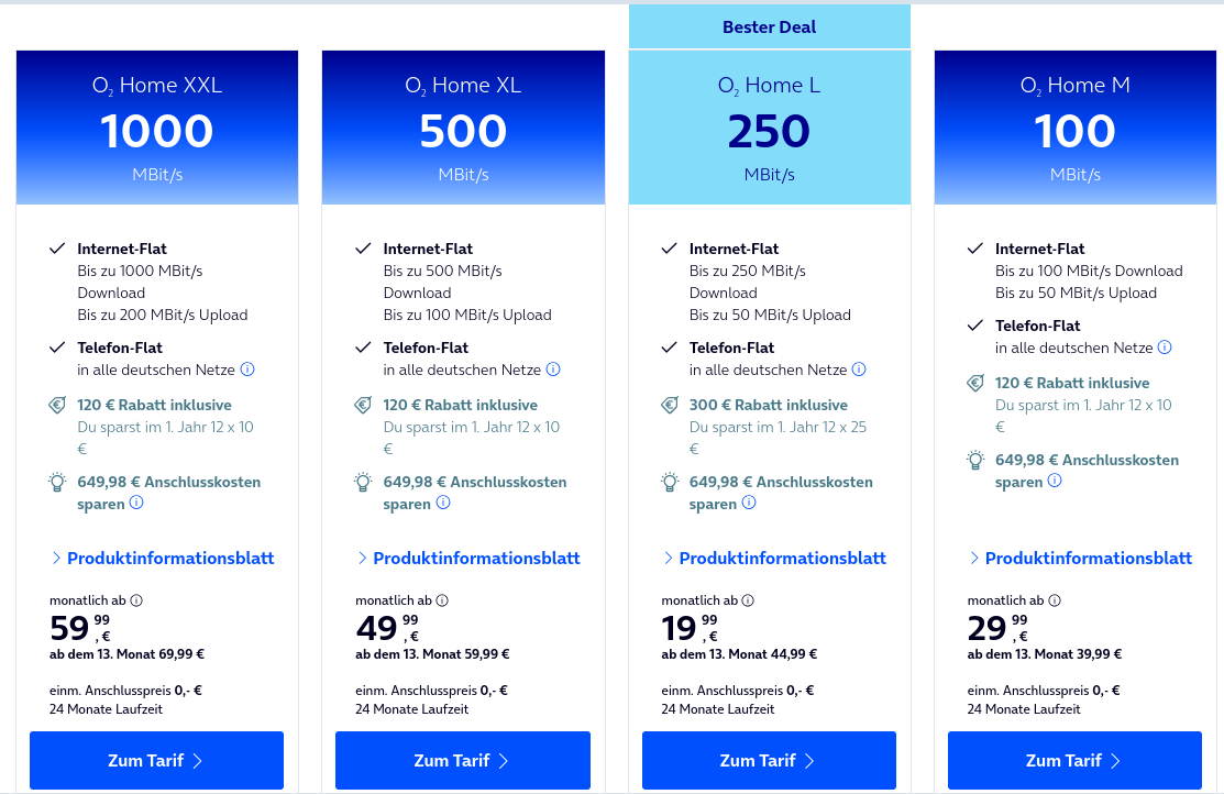 Zeitnah hat 1&1 diese Geschwindigkeiten in ihren GF-Tarifen eingepflegt. Seltsamerweise vermisst man dieses Update seit nunmehr 3 Monaten aber beim Reseller O2. Kann jemand sagen, weshalb O2 so verfährt, und wann ggf. mit einer Anpassung der GF-Tarife bei O2 zu rechnen ist?