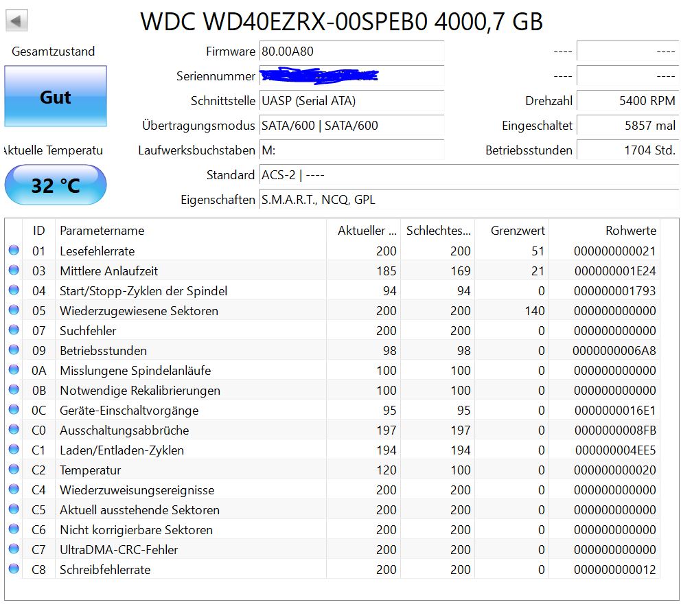 Also Gehäuse geöffnet, ausgebaut erst intern ran gehängt, dann in einem anderen 3,5" Gehäuse... Auch mal Pins abgeklebt etc. Immer die selbe Meldung auf Windows: