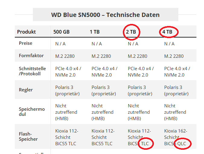 Dass sich hinter der WD Blue SN5000 mit 4 TB Speichervolumen eine SSD mit eigentlich unliebsamem QLC-Speicher verbirgt, merkt man im Test praktisch nicht. Die große Schwäche der meisten QLC-SSDs, nämlich die schnarchlahme Schreibrate nach dem SLC-Turbo, bleibt schlicht aus. Der aktuelle BiCS6-QLC-NAND von Kioxia und Western Digital erreicht zumindest in dieser Konfiguration durchaus die Schreibleistung einer TLC-SSD der Mainstream-Klasse. Bravo!