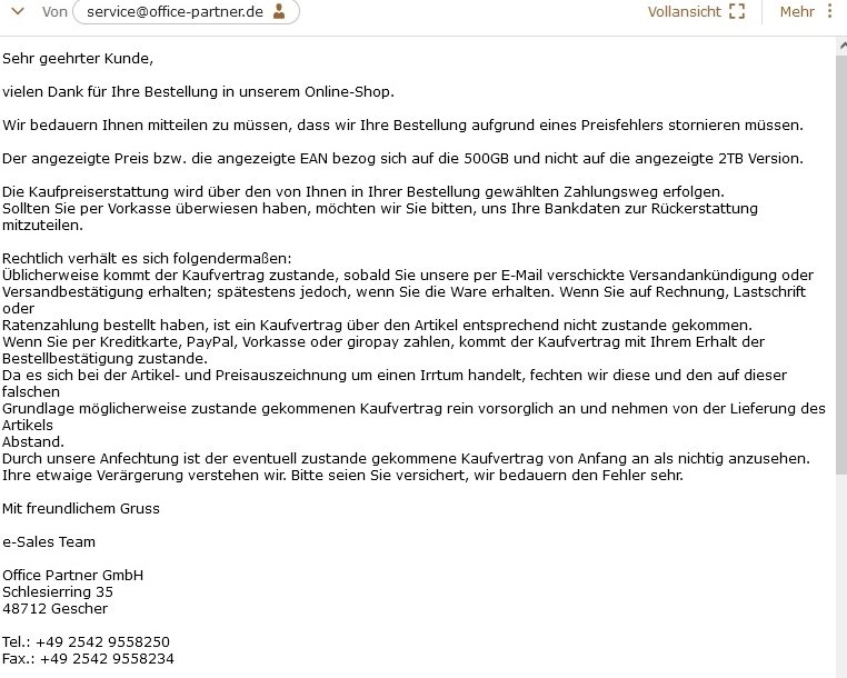 es war ein preisfehler. sowas passiert. Die meisten hier haben die ssd in dem Wissen bestellt.coxon schrieb:Jap, mein Storno kam auch vorhin. Ich weiß wo ich nie wieder bestelle! Saftladen! 😂😅