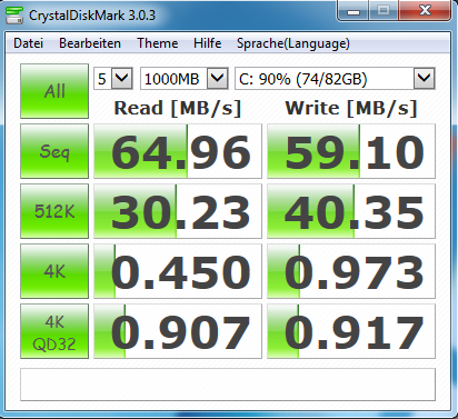 Habe mal noch CrystalDiskMark laufen lassen. Bei meinen zwei Partitionen ergeben sich ziemliche Unterschiede. Ich habe auf einer Partition C: praktisch nur das System und Treiber drauf. Liegt das Geschwindigkeitsproblem daran, dass ich diese Partition zu klein gewählt habe?