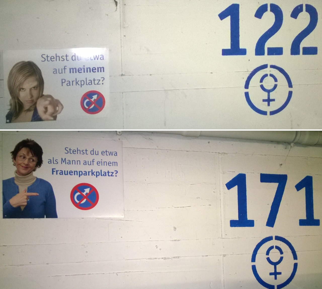 Und ein Mann hat darauf mit seinem Karren einfach nichts verloren. Solche Plakate gäbe es ja nicht, wenn es nicht ständig vorkommen würde, dass ein Mann auf Frauenparkplätzen parkt.